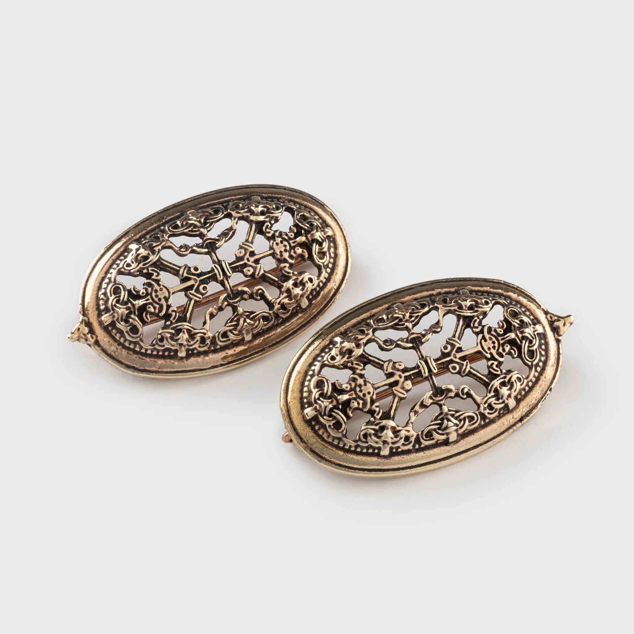 Ett par smÄ, omsorgsfullt handgjorda broscher inspirerade av ett fynd frÄn Borre i Norge.