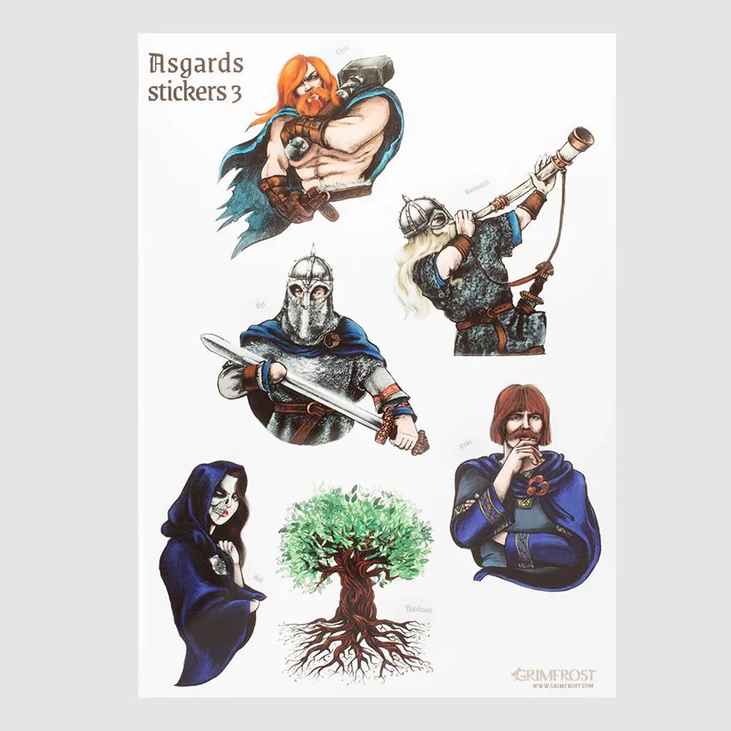 Ingår som klistermärken: Oden, Tor, Frigg, Tyr, Loke, Fenris, Garm, Nidhoggr, Heimdall, Freja, Frey, Angrboda, Hel, Surt, Jormungandr, Hati & Skoll, Yggdrasil